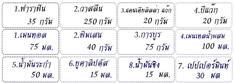 รายการสินค้ชุด 700 กรัม ส่วนที่ 1 1.ฟาราฟิน(Paraffin wax) 35 กรัม 2.วาสลีน(White petroleum) 250 กรัม