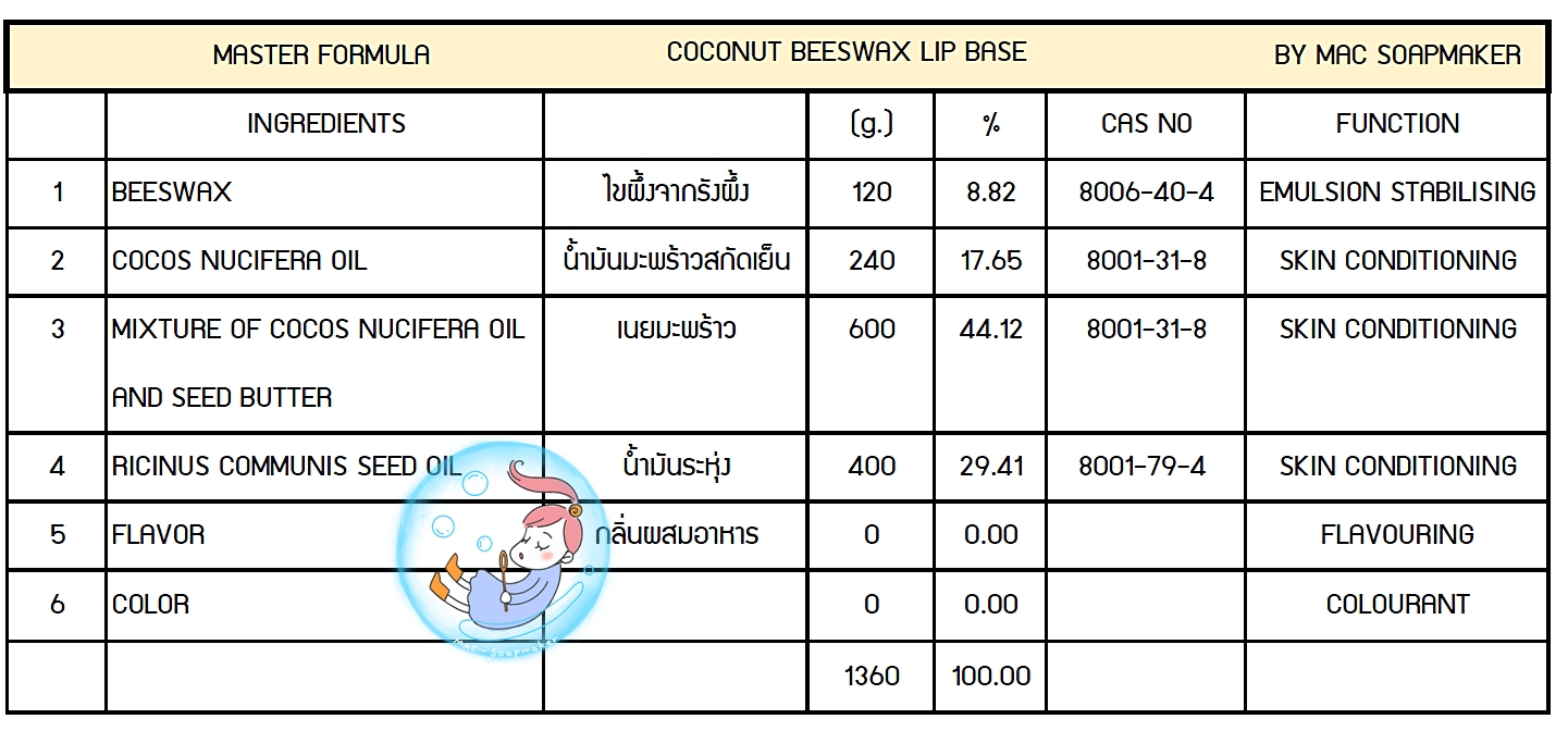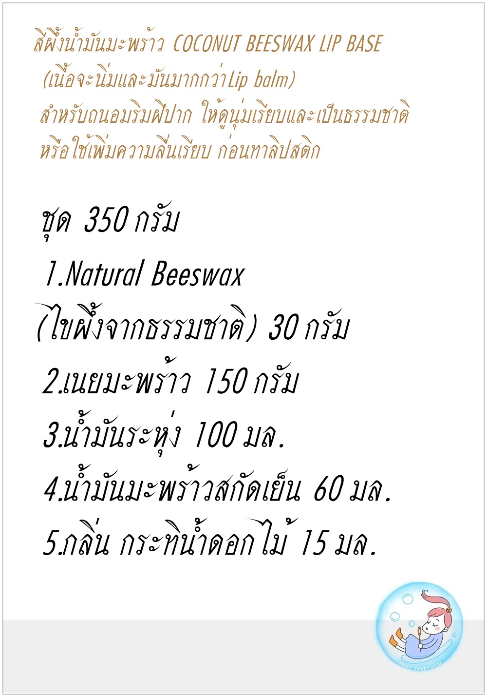 ![]() สีผึ้งน้ำมันมะพร้าว COCONUT BEESWAX LIP BASE