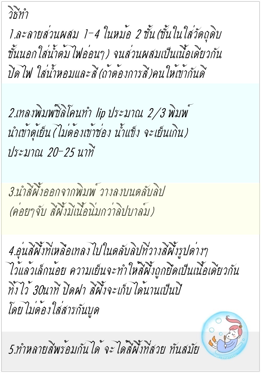 (ไม่ต้องเข้าช่อง น้ำแข็ง จะเย็นเกิน) ประมาณ 20-25 นาที 3.นำสีผึ้งออกจากพิมพ์ วางลงบนตลับลิป (ค่อยๆจับ สีผึ้งมีเนื้อนิ่มกว่าลิปบาล์ม)