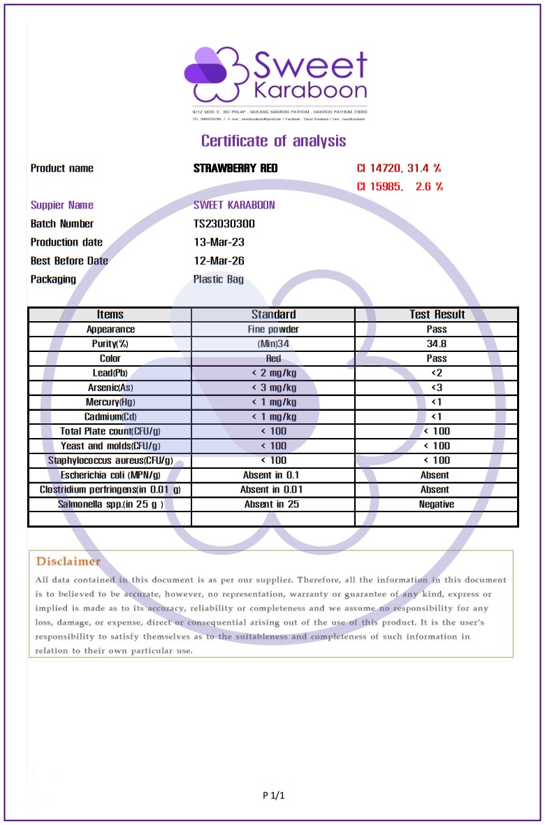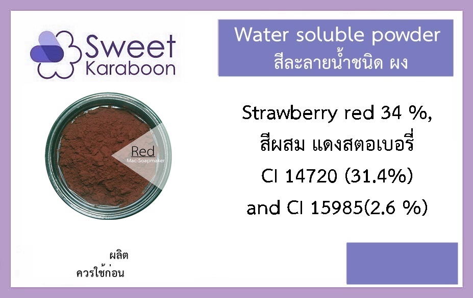 ชนิดละลายน้ำ ส่วนผสม 1.Carmoisine, CI 14720 (31.4%) 2.Sunset yellow FCF, CI 15985(2.6 %) การใช้: ใช้กับเครื่องสำอางประเภทที่ 1 Carmoisine, CI 14720 ใช้ได้กับเครื่องสำอางทุกประเภท Sunset yellow FCF, CI 15985 ใช้ได้กับเครื่องสำอางทุกประเภท การเตรียม: ควรผสมสีลงในน้ำเล็กน้อยเพื่อให้ผงสีกระจายตัว แล้วนำไปผสมหรือค่อยๆหยด ลงในผลิตภัณฑ์ส่วนที่เป็นน้ำ เช่น สบู่แบบธรรมชาติ CP,HP , สบู่เหลว, ครีมอาบน้ำ, โลชั่น, บาทบอม, แชมพู เจลแอกอฮอล์ อื่นๆ ที่มีส่วนผสมเป็นน้ำ ![]() ![]() |