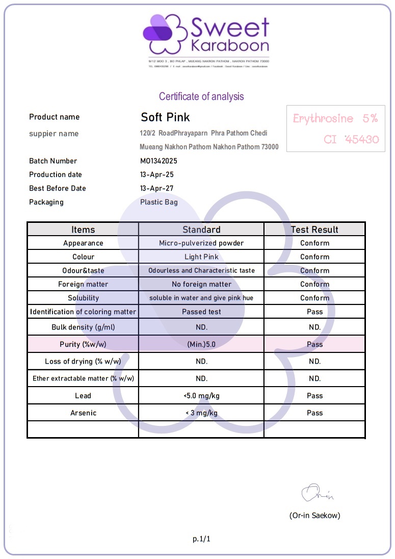 Color Pink : Soft Pink สีชมพู อ่อน CI 45430 ; 5 % สีชนิดผง ละลายได้ในน้ำ COA